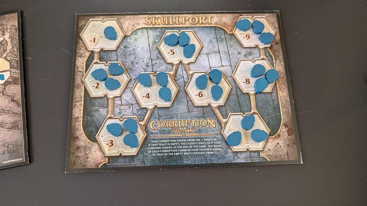 For all of this boodle, the player also has to pick up a corruption point from the corruption track. If not disposed of by the end of the game, these skulls take away from the players final score, based on how many points have been taken from the corruption track, and how many skulls they still have