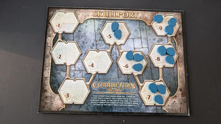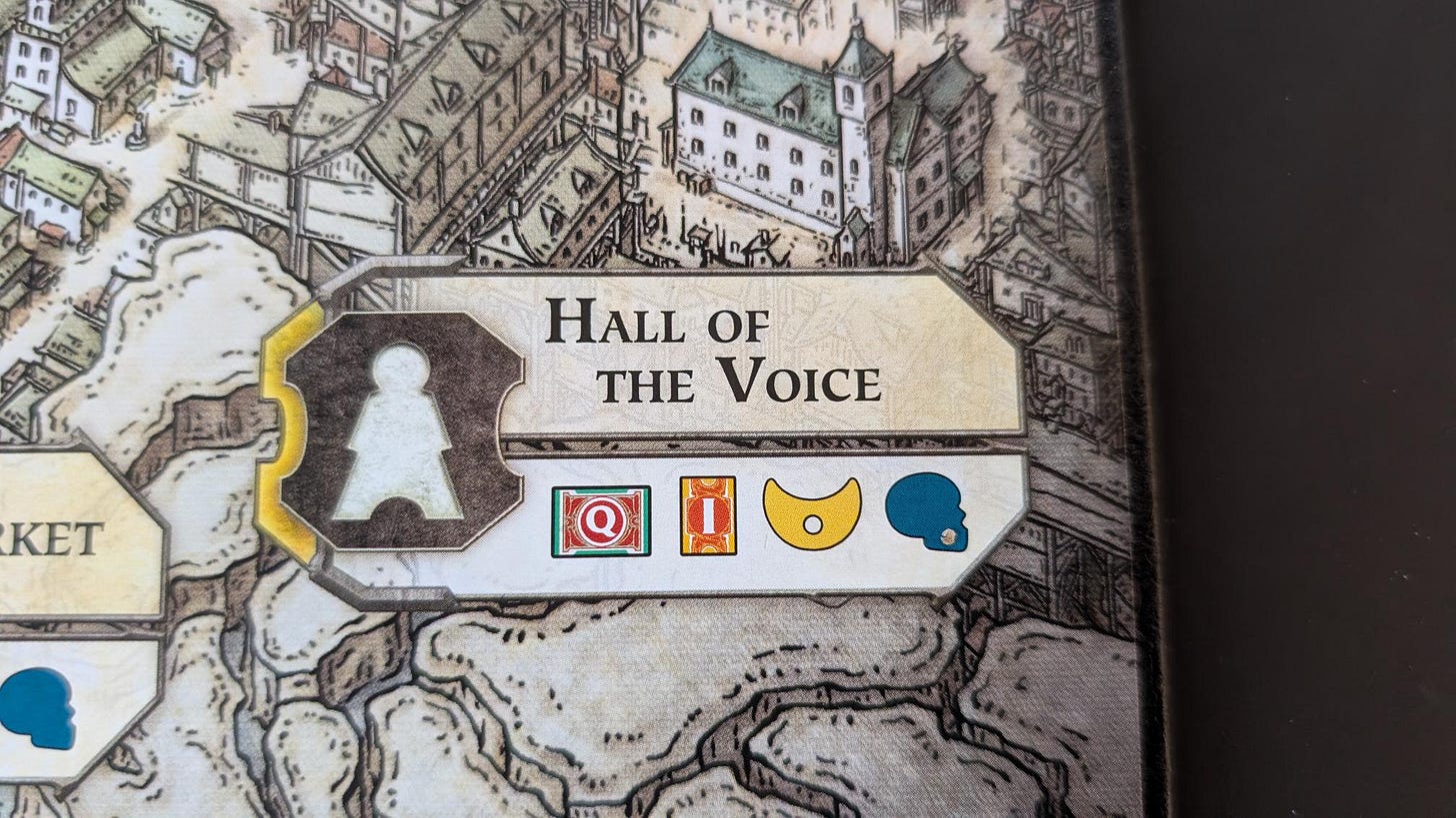 The Scoundrels of Skullport expansion introduced the corruption track. This added spaces like the Hall of The Voice, where a player can pick up 5 gold pieces, as well as a quest card and an intrigue card, which gives you a one-time special ability.