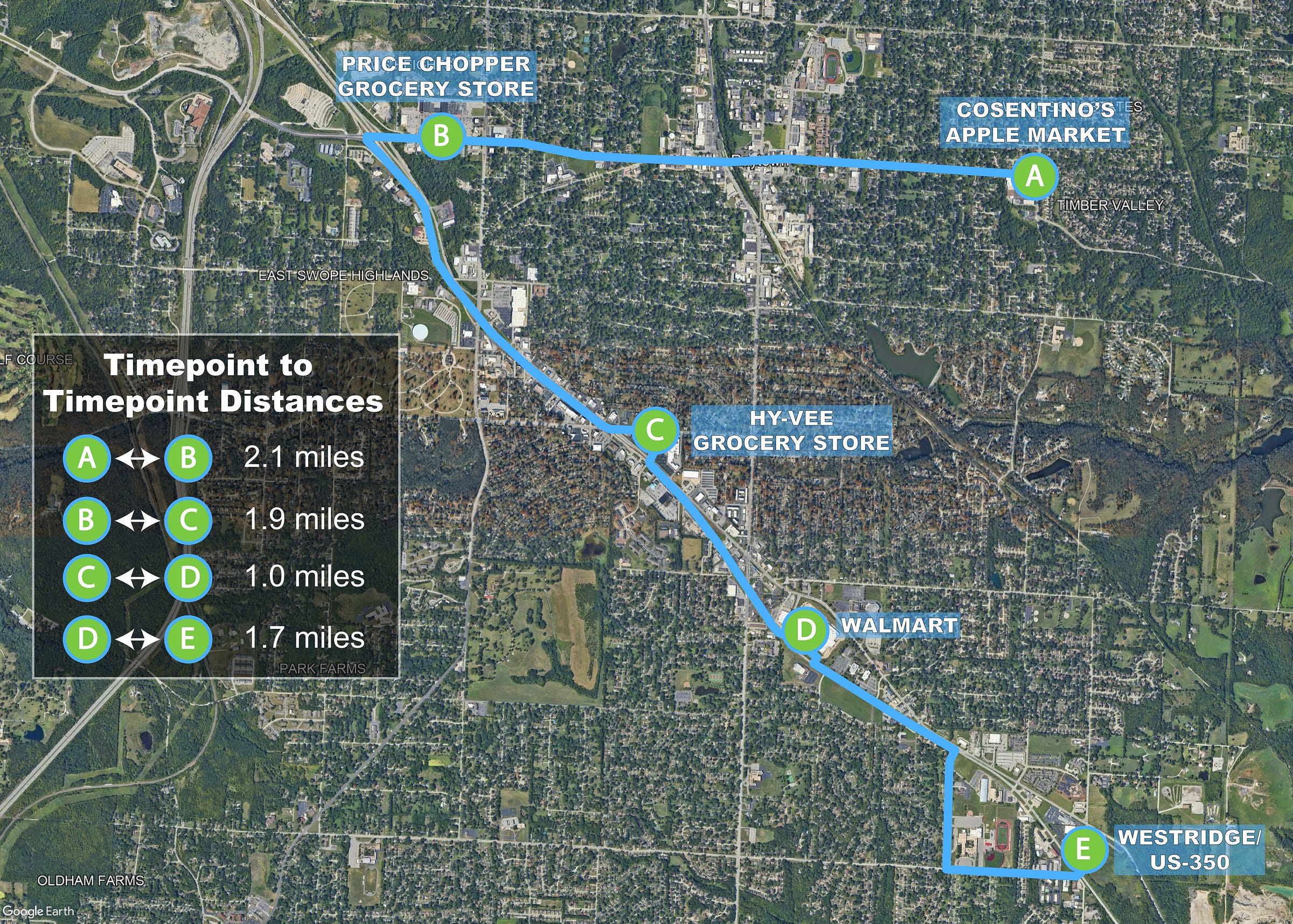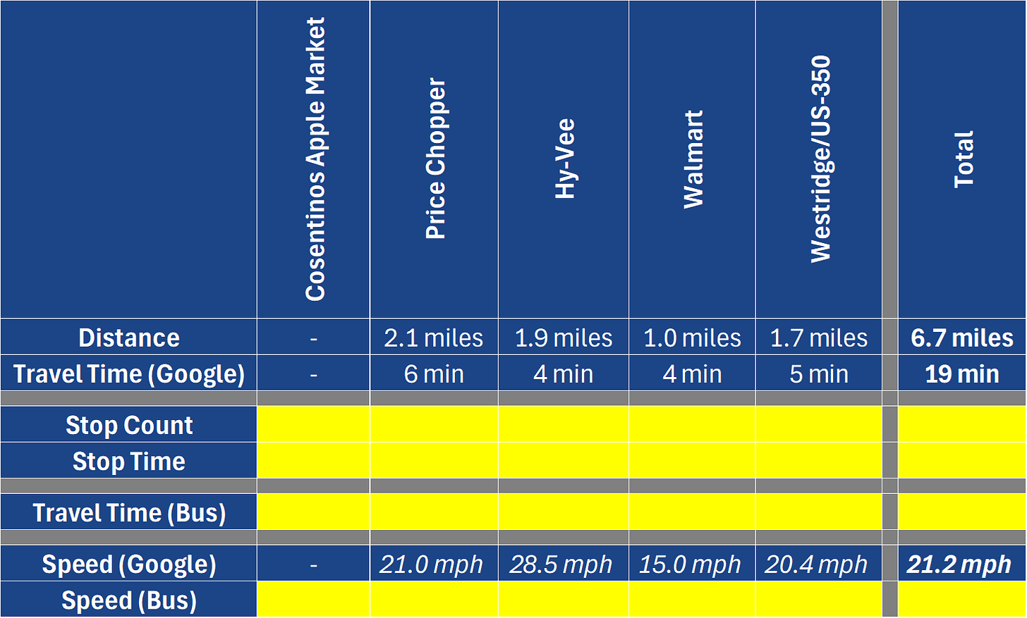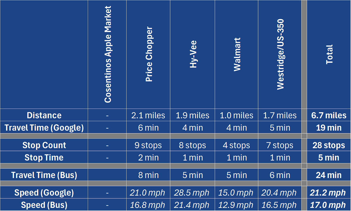 This route connects major destinations throughout Raytown, MO, an immediate suburb of Kansas City, MO. If you plug the timepoints from this route into Google Maps like so, you can view the distances and travel times between timepoints. From this information you can get travel speeds between the timepoints, as well as the travel time and speed for the entire route. In a car, this 6.7 mile route would take 19 minutes, at an average speed of 21.2 mph.