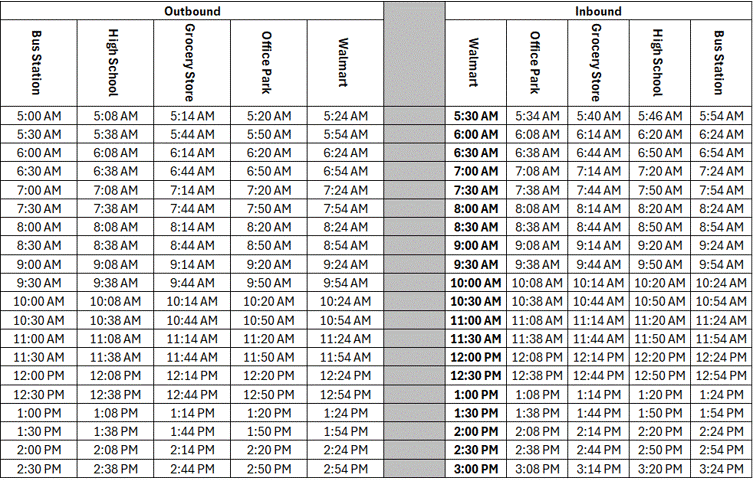 From this schedule, we learn that it takes 24 minutes for the bus to travel between the bus station and Walmart. We also learn that it takes 8 minutes to get from the bus station to the high school, 6 minutes to get from the high school to the grocery store, 6 minutes to get from there to the office park, and 4 more minutes to get to the Walmart. These timepoint to timepoint runtimes are the domain of the transit scheduler.