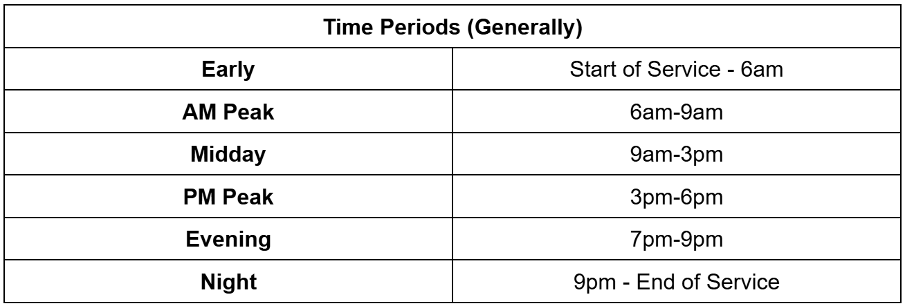 The runtime is not attempting to perfectly model how long each trip in the schedule takes, it’s meant to capture how long it takes the average bus driver to complete the trip. Since runtime often changes throughout the day, runtimes are typically broken out by time period, with specific runtimes applied to specific times of day. Here are the time periods I typically start with when building a runtime from scratch.