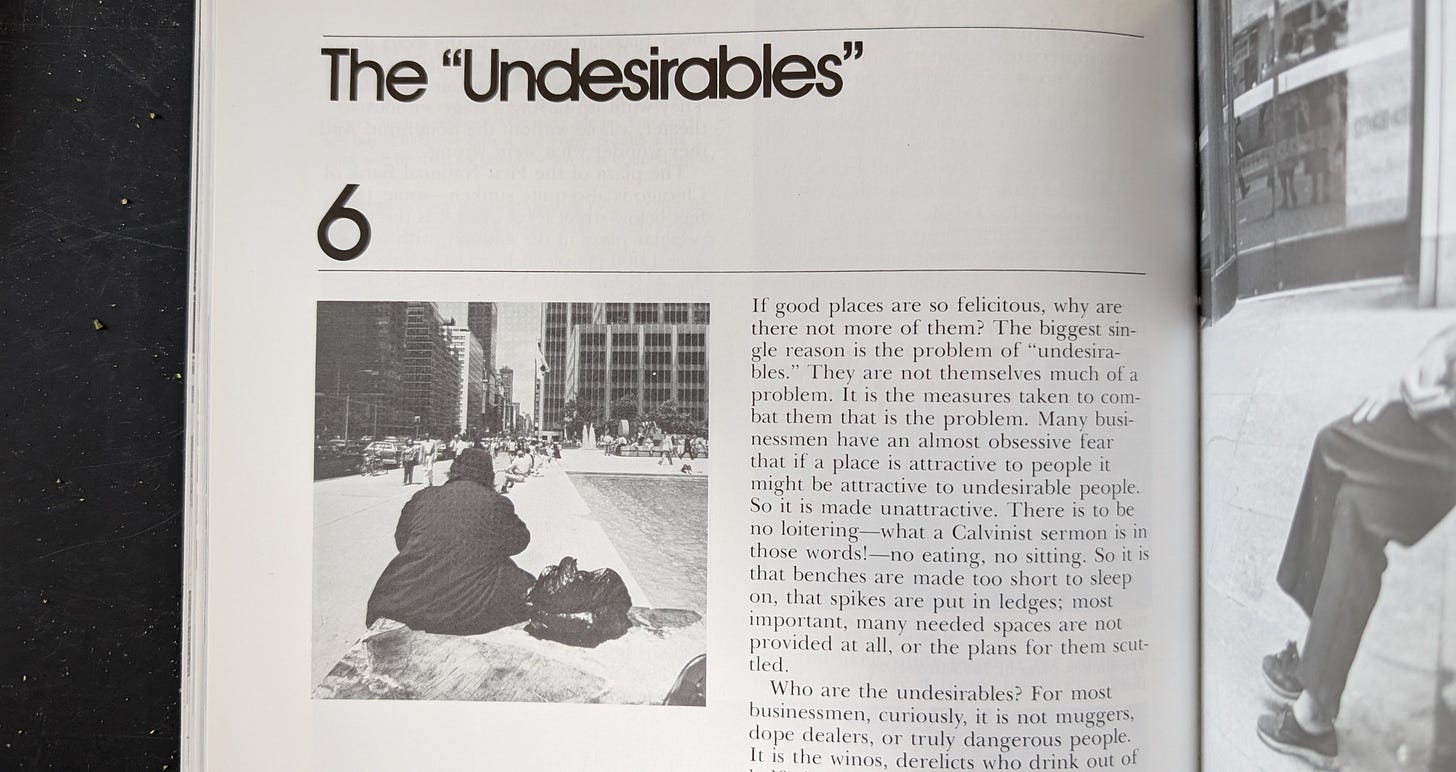 Good Transit isn't necessarily comfortable, but it's not uncomfortable. Hostile architecture is hostile to everyone, not just the people you're trying to discourage. William H Whyte says it better than me